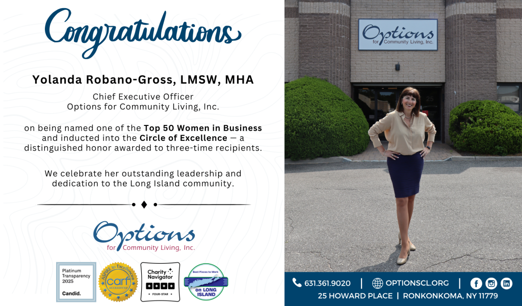 Options for Community Living, Inc. is proud to announce that Chief Executive Officer, Yolanda Robano-Gross has been inducted into the Long Island Business News 2025 Circle of Excellence. This prestigious award recognizes individuals who have been honored three times among the Top 50 Women in Business, highlighting Yolanda’s sustained excellence in leadership, business acumen, and community impact.