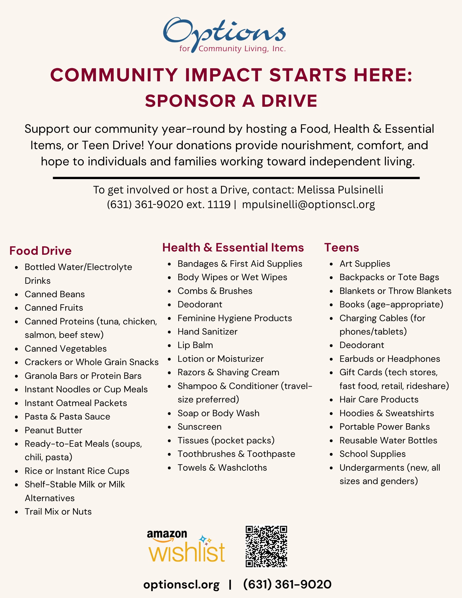 Join Options for Community Living in our mission to help Long Islanders in need today! The projects listed below are examples. Do you have a unique project in mind that is not listed below? Reach out to us and see if it’s possible!